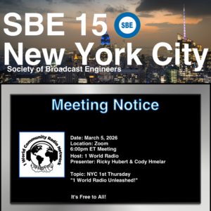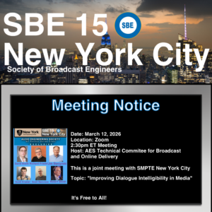 With more than 5,000 members and 114 local chapters, the SBE provides a forum for the exchange of ideas and sharing of information to help you keep pace with our rapidly changing industry. The SBE amplifies the voices of broadcast engineers by validating your skills with professional certification, by offering educational opportunities to maintain and expand those skills and by speaking out on technical regulatory issues that affect how you work. SBE 15 is the local New York City Chapter. We welcome broadcast engineers and anyone interested in the technologies of broadcast radio, television and associated fields.